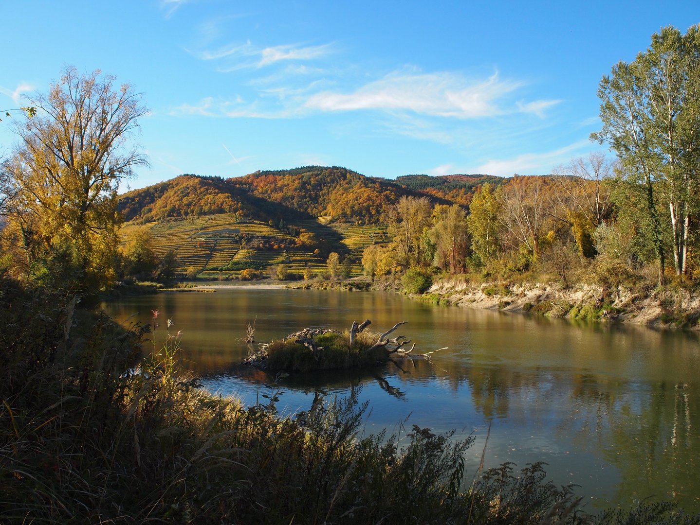 Laubwälder und Weingärten präsentieren sich zur Zeit von ihrer schönsten Seite. Außerdem gibt die herbstliche Niederwasserperiode gerade weiße Schotterinseln frei. Verfärbtes Laub, flache Ufer und ein langer ruhiger Fluss, auch das ist Auenwildnis Wachau. Das Planungsteam kann nicht pausieren: Variantenentscheidungen stehen an.